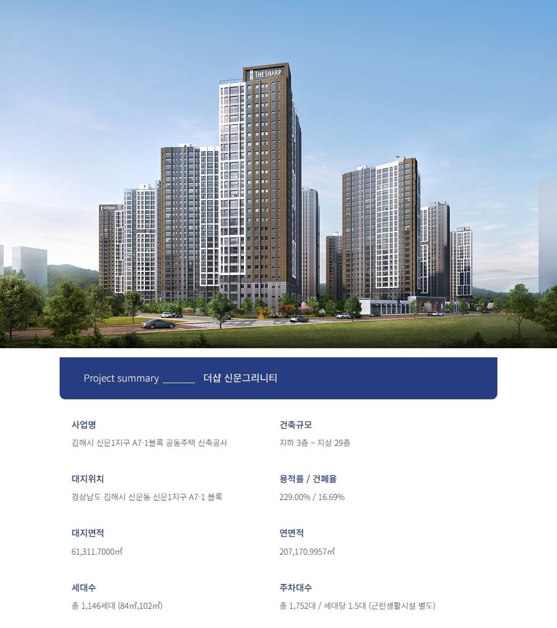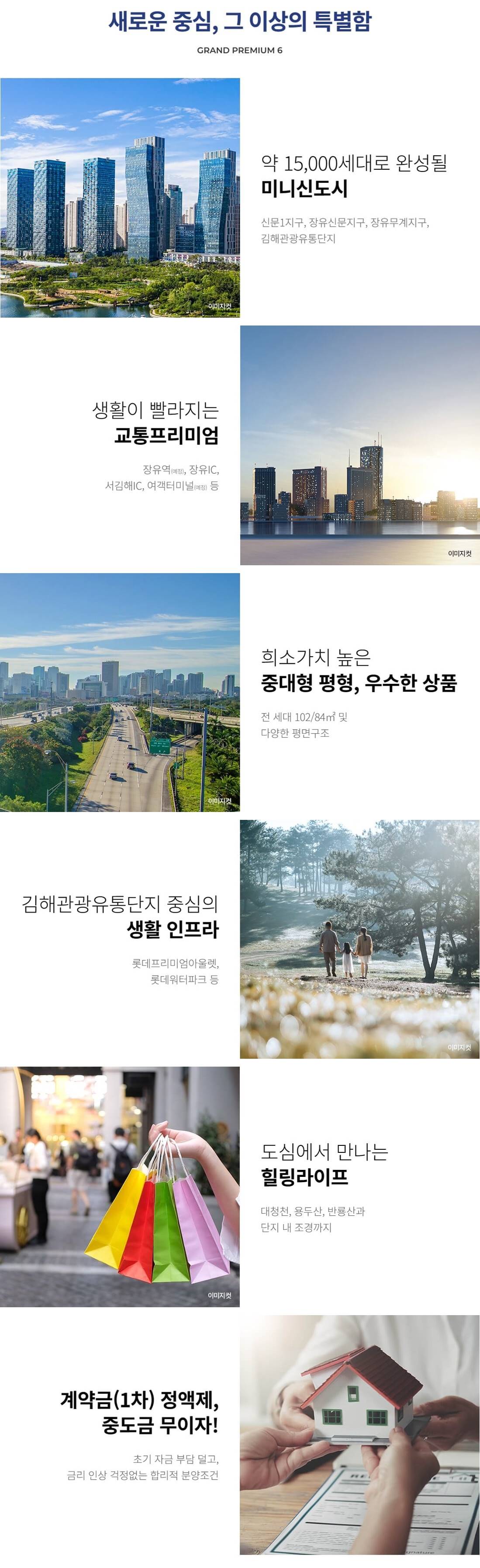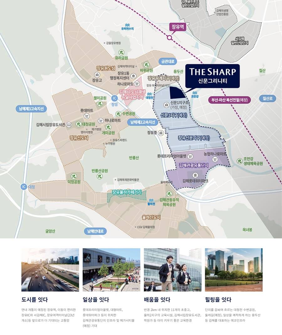 신문지구의 압도적 브랜드 파워 더샵이 완성하는 김해의 새로운 주거 중심지 신문지구 내 1차와 함께 대규모 브랜드 타운을 형성하며 더샵만의 품격 있는 주거 가치와 프리미엄을 선사합니다. 장유 신문지구의 비전과 가치 신도시급 주거 인프라를 누리는 미래 투자의 핵심 장유신문지구와 무계지구를 잇는 대규모 주거 벨트의 중심으로 향후 김해를 대표할 새로운 랜드마크 단지로 주목받고 있습니다. 풍부한 생활 인프라와 쇼핑 환경 롯데 워터파크와 롯데 아울렛이 인접한 편리한 생활 대형 쇼핑 및 문화 시설을 가깝게 이용할 수 있어 일상의 즐거움과 주거의 편의성이 완벽하게 조화된 생활 환경을 제공합니다. 자연과 함께하는 그리니티 라이프 조만강과 수변공원을 품은 쾌적한 숲세권 단지 단지 인근의 조만강과 풍부한 녹지 공간을 통해 도심 속에서도 자연의 여유를 만끽하는 진정한 힐링이 가능합니다. 더샵만의 혁신적인 특화 설계 공간 활용을 극대화한 평면과 고품격 커뮤니티 입주민의 라이프스타일을 고려한 세심한 설계와 더샵만의 차별화된 커뮤니티 시설로 주거 만족도를 극대화했습니다. 부전 마산 복선전철의 쾌속 교통 부산과 창원을 더 가깝게 잇는 광역 교통망 장유역을 통한 우수한 광역 접근성과 더불어 인근 도로망을 이용해 인접 대도시로 빠르게 이동할 수 있는 요충지입니다.